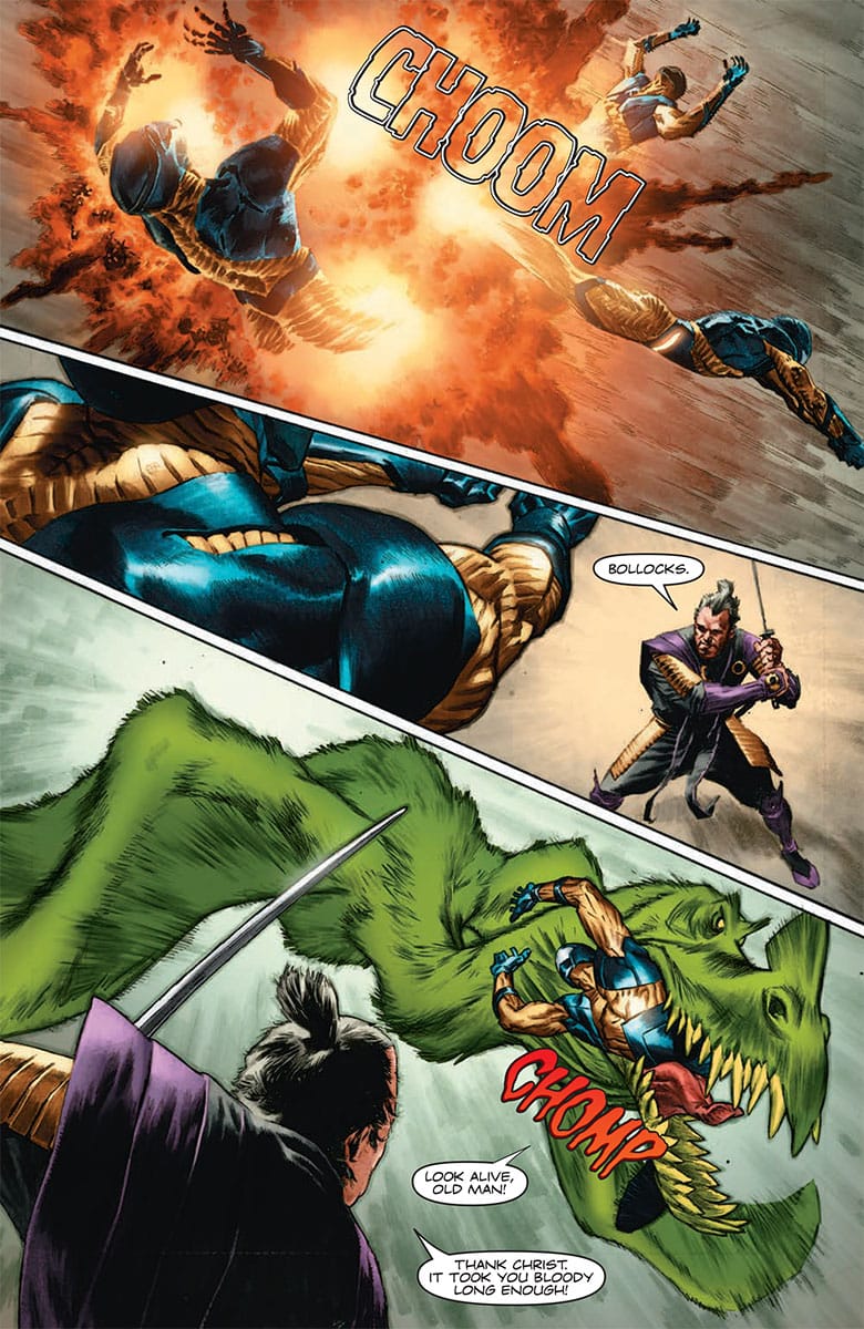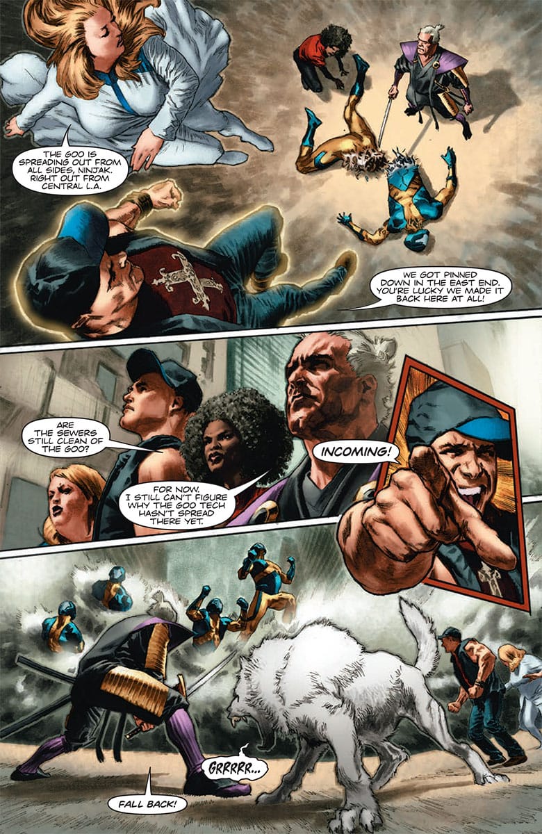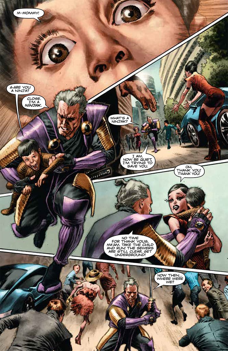 Far into a post-apocalyptic future, Los Angeles has descended into chaos…and even the remaining heroes of the Valiant Universe can’t stand against the G.A.T.E. super-tech that now dominates the wastelands. As Bloodshot and his longtime love Magic emerge from their desert refuge with a small group of survivors in tow, an unexpected acquaintance from the past returns, seeking help and forcing Bloodshot to either turn his back on his friends…or his family! But is the master assassin once called Ninjak truly an ally… or a foe lying in wait?