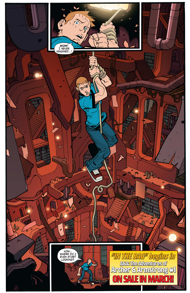 Why the momentous occasion, you ask? Because on March 16th, Valiant’s (somewhat) dynamic duo are beginning an all-out assault on the senses in A&A: THE ADVENTURES OF ARCHER & ARMSTRONG #1 – the FIRST ISSUE of an ALL-NEW ONGOING SERIES from rising star Rafer Roberts (Plastic Farm, Shutter) and superstar artist David Lafuente (Ultimate Spider-Man)! Valiant’s next blockbuster series starts here in March with “IN THE BAG” – a insane rescue mission sending Archer into the depths of Armstrong’s bottomless satchel to free his roguish partner from an ages-old enemy…but only if he can fight his way through a mind-bending maze of history’s greatest lost treasures first!