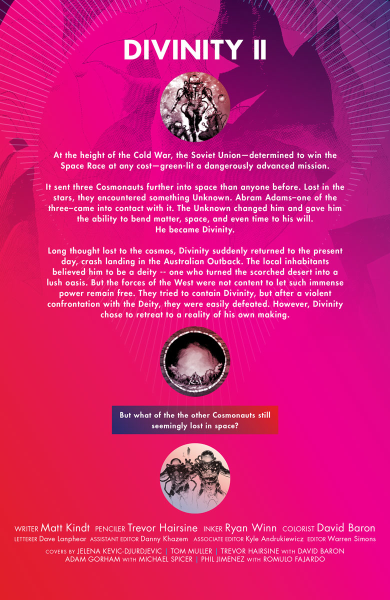 The much-anticipated follow-up to the 11-time, sold-out series that The Onion/A.V. Club calls the “Best New Superhero of 2015” is here! The acclaimed creative team returns for a perfect new jumping-on point into the expansive sci-fi saga that shook the world! Get ready for Divinity II #1 (of 4)!