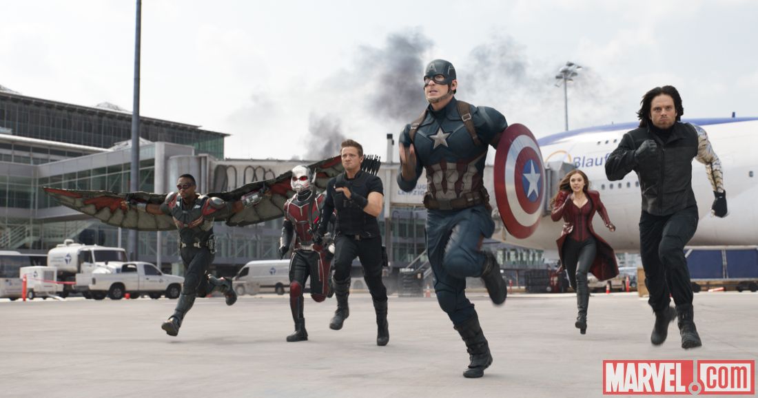 Captain America: Civil War debuts May 6, 2016, starring Chris Evans, Robert Downey Jr., Scarlett Johansson, Sebastian Stan, Anthony Mackie, Paul Bettany, Jeremy Renner, Don Cheadle, Elizabeth Olsen, Paul Rudd, Chadwick Boseman, Emily VanCamp, Daniel Brühl, Frank Grillo, William Hurt, and Martin Freeman.